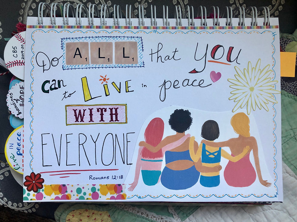 My family is doing this peace template collaboratively. We're each adding verses, doodles, and coloring. I love the mix of handwriting styles and illustrations on these family pages!